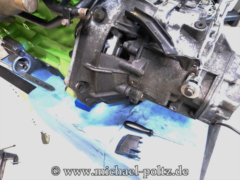 Das "Guckloch" in der Getriebeglocke ist eine große Hilfe beim "Einfädeln".