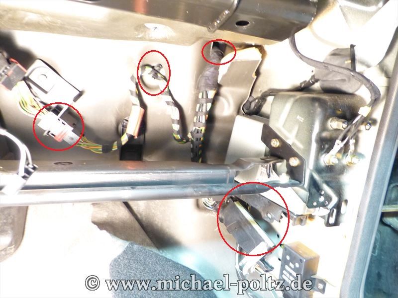 Anschließend baut man den, hinter dem Handschuhfach liegenden, Luftkanal aus. Wahrscheinlich kommt man an den Motorkabelbaum auch so ran, aber aus Bequemlichkeit (und für die Fotos) ist es so besser. Den Motorkabelbaum dann an den zwei Steckern und einem Kabelbinder lösen, und anschließend durch die Spritzwand führen. Jetzt noch das Getriebe in den vierten Gang schalten und schon ist man im Innenraum fertig.