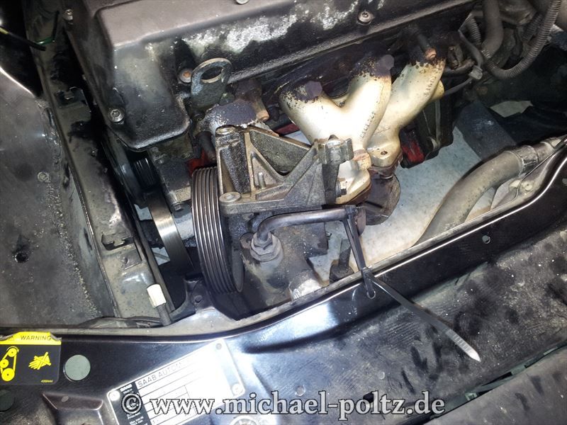 Hat man den Riemen ab, kann man die Servopumpe abschrauben (Drei Schrauben - die untere ist schwer zu sehen, aber mit Ratsche und Verlängerung gut zu erreichen), und am Frontblech befestigen - sie bleibt im Auto.