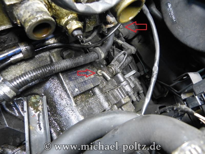 Inzwischen sollte das Kühlwasser komplett abgelaufen sein, also kann man nun sämtliche Kühlwasserschläuche entfernen (Kühler hin/rück, Wärmetauscher hin/rück und Ausgleichsbehälter). Anschließend kann man den Kunststoffpin aus dem Getriebe entfernen und mit einem 4mm Inbus-Schlüssel das Getriebe im vierten Gang arretieren (Der vierte Gang war ja ganz zu Anfang eingelegt worden). Den Stecker vom Rückfahrlichtschalter lösen und zur Seite führen. Als nächstes löst man die Klemmschraube um das Schaltgestänge lösen zu können (oberer Pfeil).