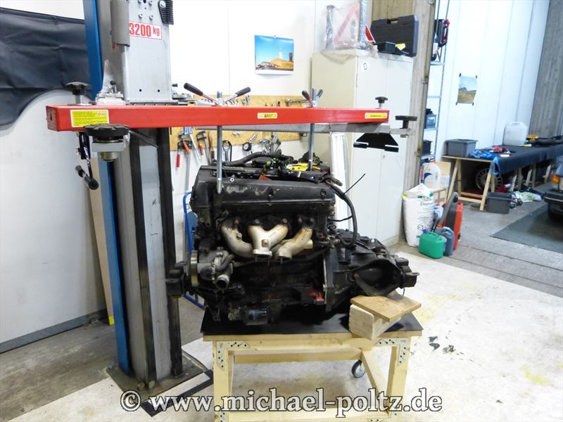 Um das Getriebe besser abziehen zu können, habe ich den Motor mit der Traverse (die über die Tragarme der Bühne gelegt war) leicht angehoben.