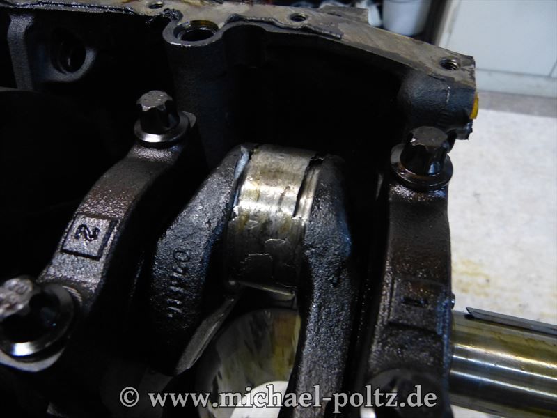 Der Lagerschalen von Pleuel 1 haben sich "Scheibchenweise" zerlegt und liegen nun wie Blätterteig um den Lagerzapfen der Kurbelwelle.